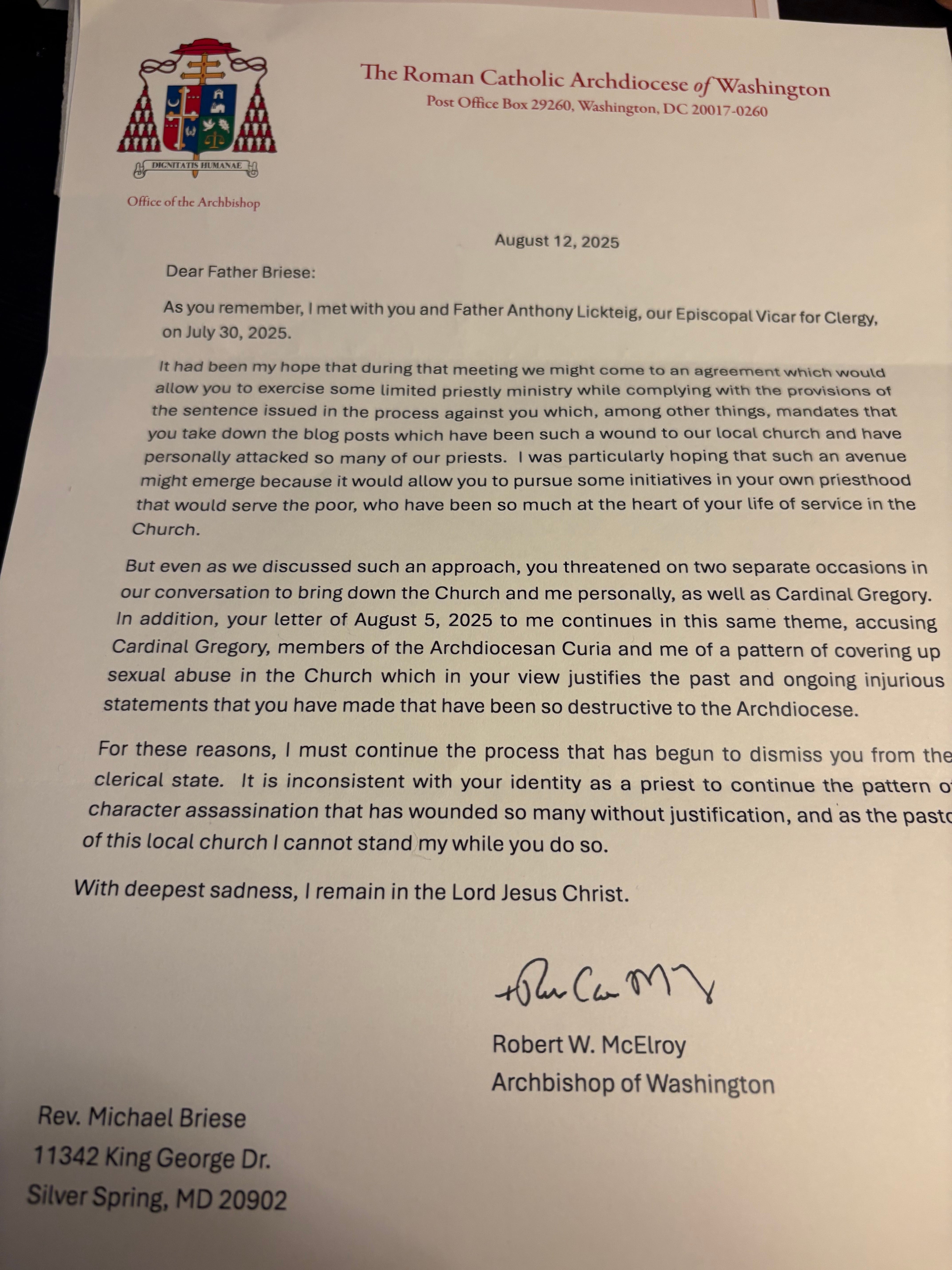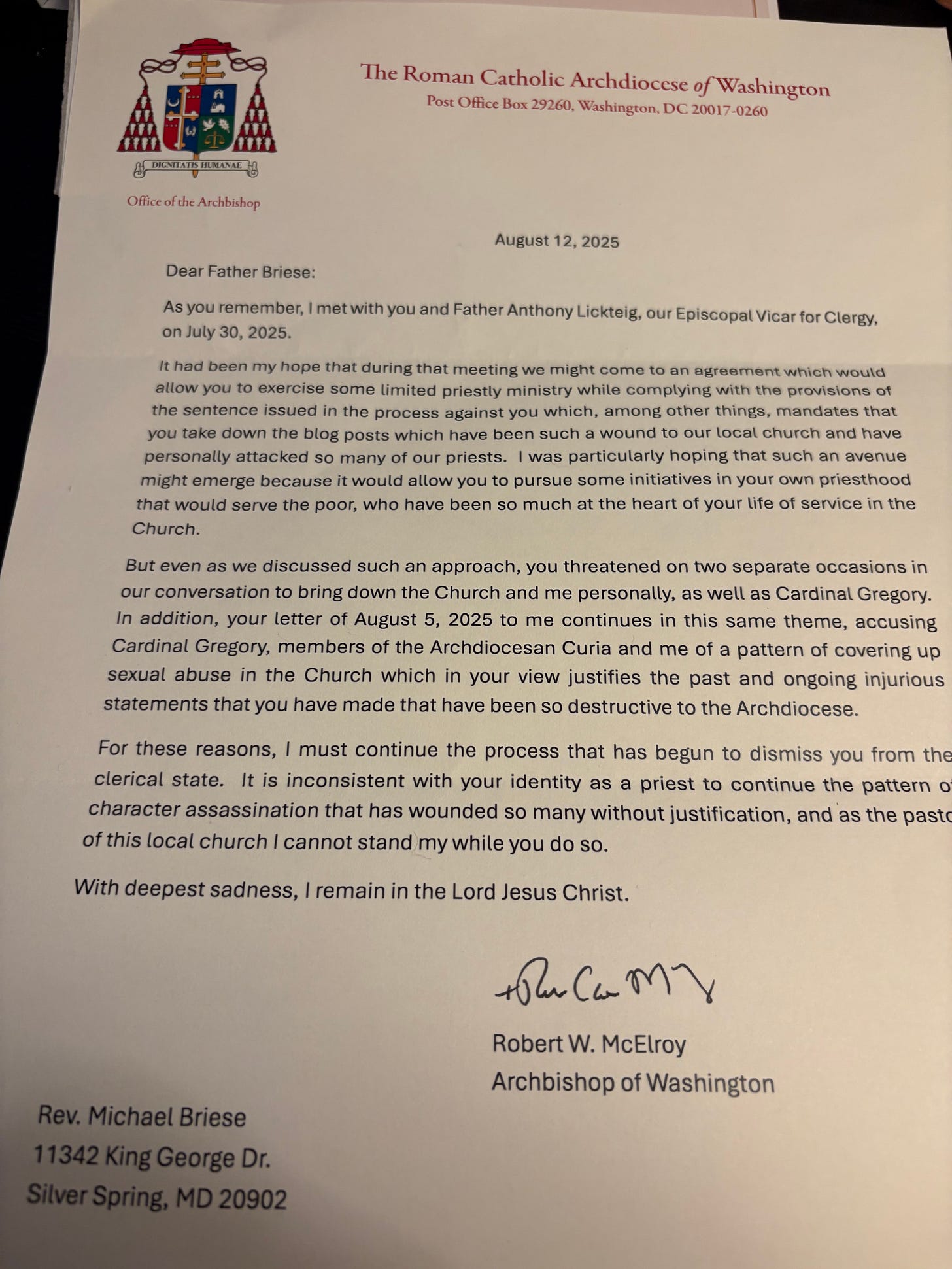 Father, you are in the esteemed company of the late, great George Neumayr. He was murdered by the D.C. diocesan hierarchy. Right now, they are just trying to kill your priesthood. Contact Fr. Altman, he can get you the help you need to battle these Sodomites. kwilliams@canceledpriests.org